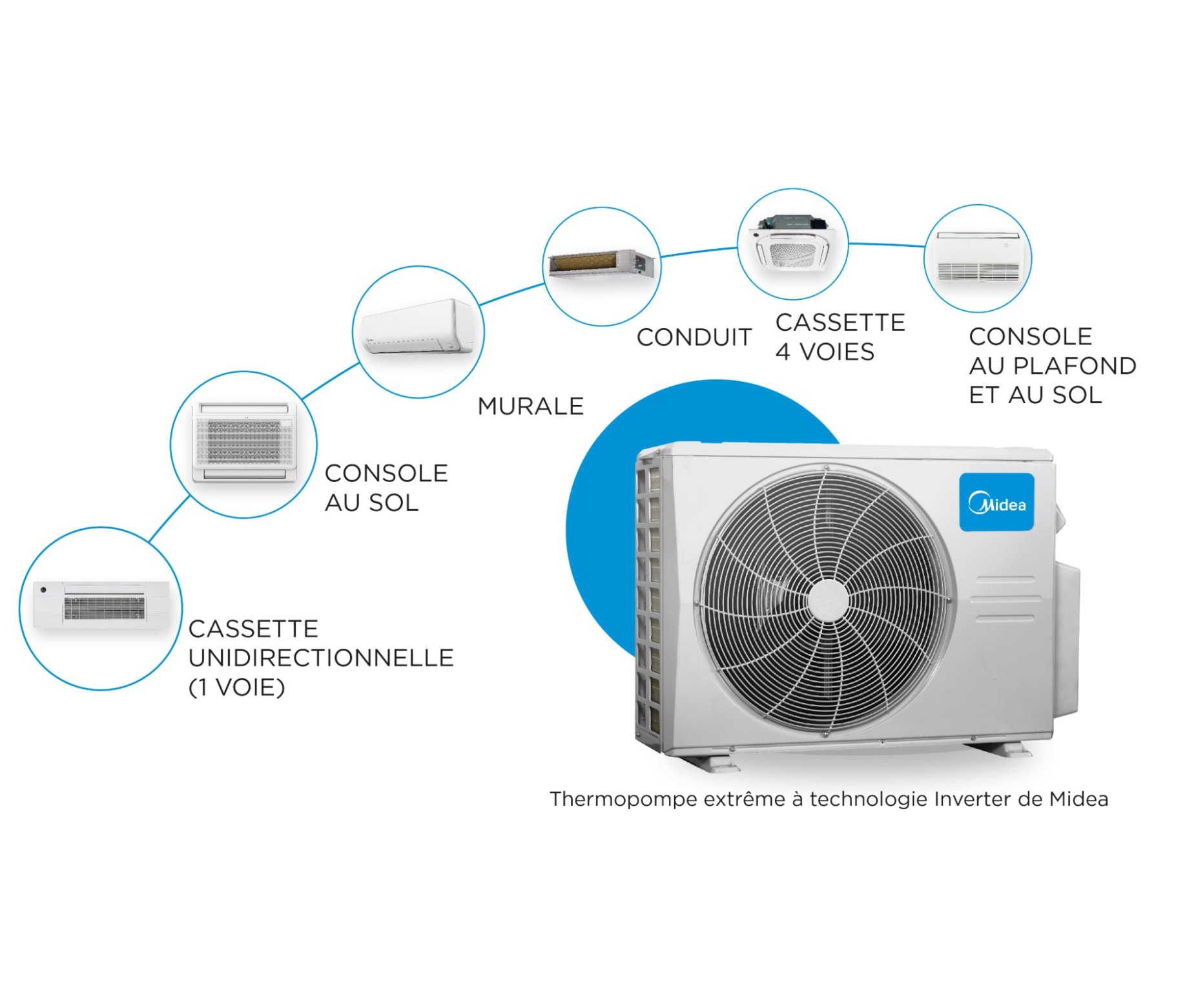 Le système multizone de Midea connecte une seule thermopompe à onduleur à plusieurs unités CVC intérieures, permettant un chauffage et un refroidissement efficaces dans plusieurs pièces à la fois. Chaque unité intérieure peut être contrôlée individuellement, programmée et réglée à la température souhaitée.